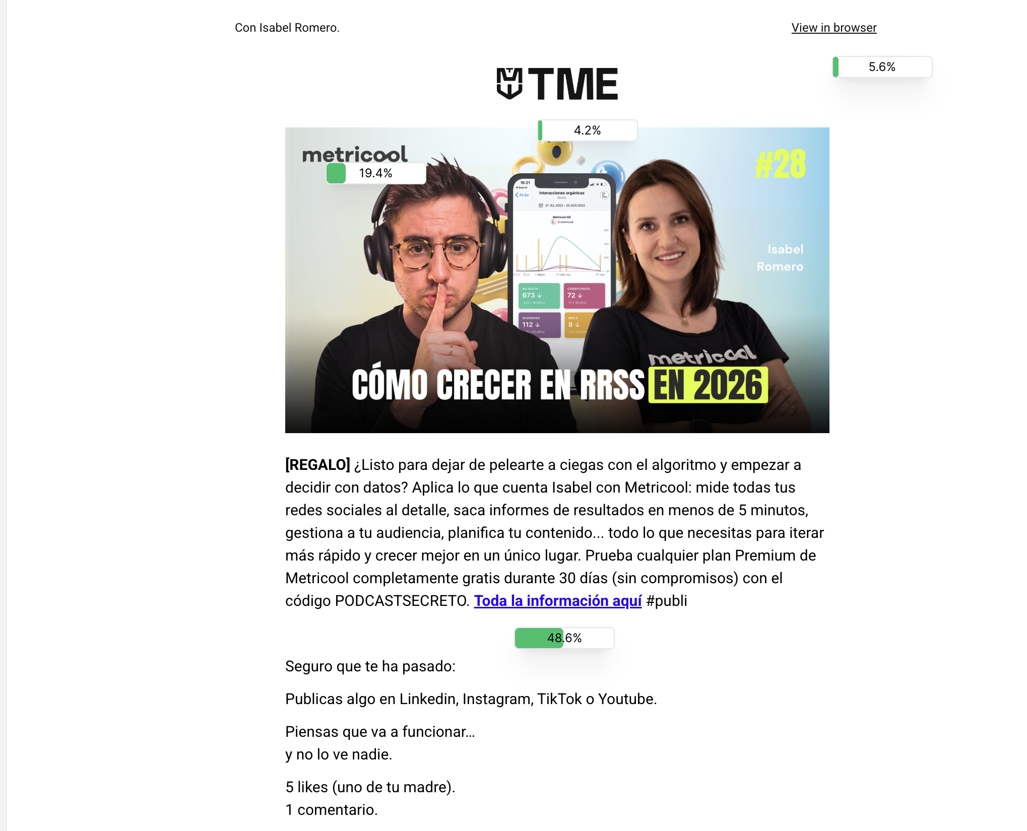 - Presencia del beneficio o descuento + enlace en los 3 emails del episodio.