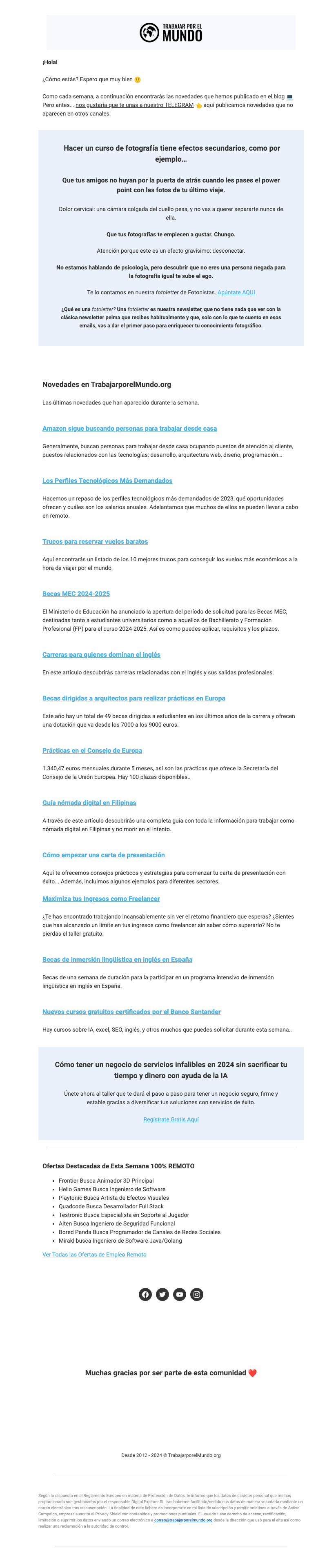Portal web que funciona desde 2012 donde publicamos oportunidades para trabajar y estudiar por el mundo. En nuestra news semanal hacemos un resumen de las noticias y convocatorias que han aparecido durante la semana en la web.